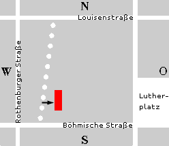 Die Skulptur Rio,Rio steht auf dem Flachdach des Seitengebäudes der Böhmischen Straße 27. Das Grundstück in der Äußeren Dresdner Neustadt wird eingegrenzt von 4 bebauten Straßen. In den Innenhöfen steht die Stirn des Seitengebäudes der Böhmischen Straße dem Nordbad in der Louisenstraße gegenüber. Ein Weg verbindet beide Straßen miteinander.
